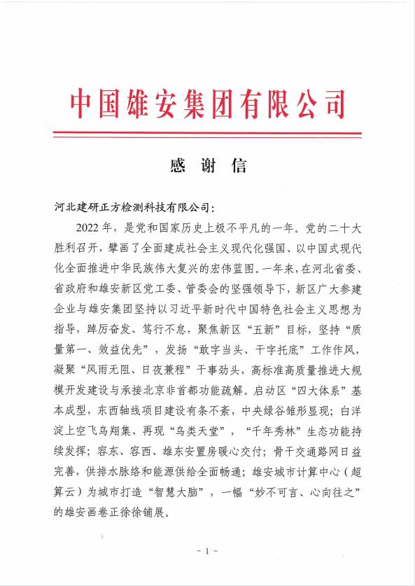 近日,建研正方公司收到雄安集團發(fā)來的感謝信,對建研正方公司2022年為雄安新區(qū)發(fā)展建設所做出貢獻表示感謝。