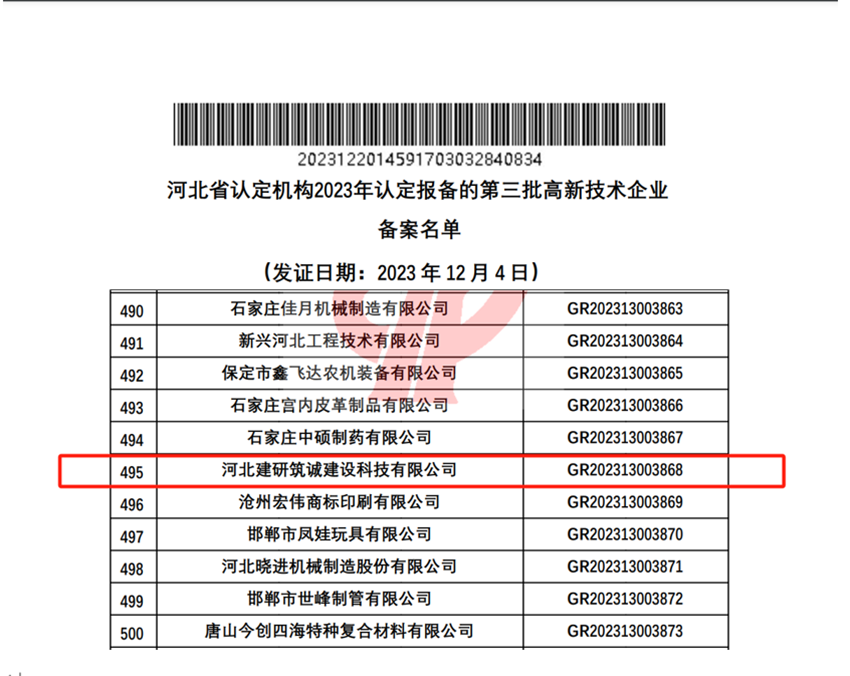 2023年12月20日,全國(guó)高新技術(shù)企業(yè)認(rèn)定管理工作領(lǐng)導(dǎo)小組辦公室公示了河北省認(rèn)定機(jī)構(gòu)2023年認(rèn)定報(bào)備的第三批高新技術(shù)企業(yè)備案名單,河北建研筑誠(chéng)建設(shè)科技有限公司順利通過(guò)了國(guó)家高新技術(shù)企業(yè)認(rèn)定(證書(shū)編號(hào)GR202313003868),標(biāo)志著公司在科技創(chuàng)新的道路上又邁出了堅(jiān)實(shí)的一步。